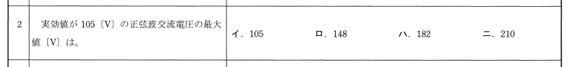 実効値105Vのときの最大値を求める問題ですので、105×√2=148Vで答えは「ロ」ですね。