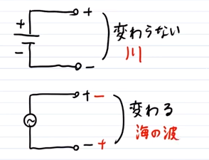 - 交流:電気の極性が切り替わる。進行方向が時間で入れ替わる「海の波」のイメージ。コンセントなど電気をたくさん消費するものに使用されることが多い。
